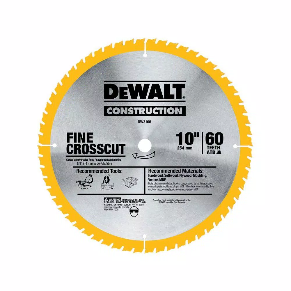 Use this fine-finishing large-diameter saw blade to perform a variety of wood crosscuts on your next construction project. The DEWALT Series 20 10 in. 60T carbide blade slices through plywood, chipboard, hardwood and softwood using a miter saw or table saw, finely carving through material with a thin kerf that fosters smooth, quick cutting action. Superb accuracy and durability comes courtesy of DEWALTβs exclusive wedge shoulder design, which places more steel behind each tip for consistent performance with each swath.