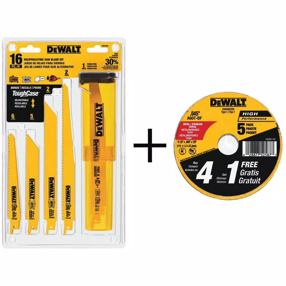 Reciprocating saw blade combination set provides a selection of blades for common applications, including metal and wood cutting. Anti-stick coating minimizes friction and gum-up. Tough case or Expandable case holds blades and is designed to fit in power tool kit box. For a limited time get a bonus 4-1/2 in. x 0.045 in. x 7/8 in. Metal and Stainless Cutting Wheel (5-Pack) with purchase.