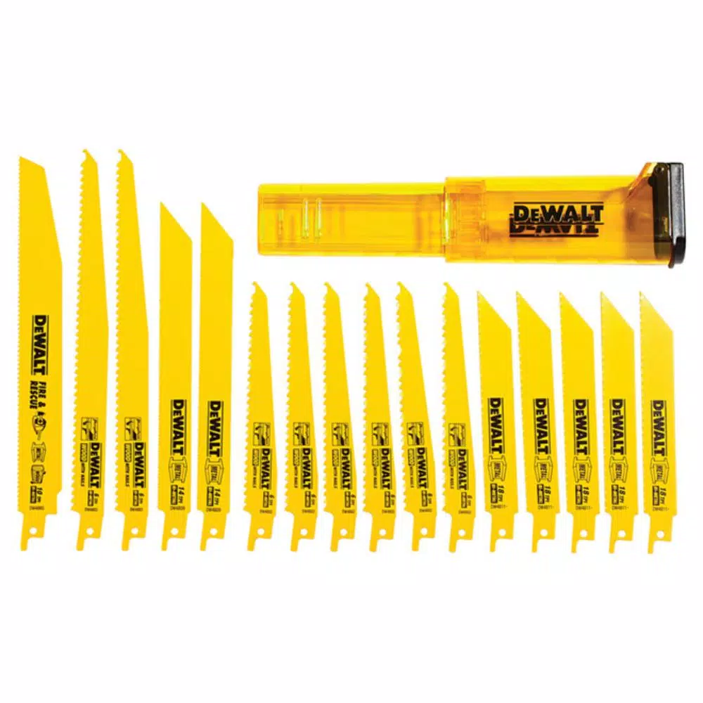 Reciprocating saw blade combination set provides a selection of blades for common applications, including metal and wood cutting. Anti-stick coating minimizes friction and gum-up. Tough case or Expandable case holds blades and is designed to fit in power tool kit box.