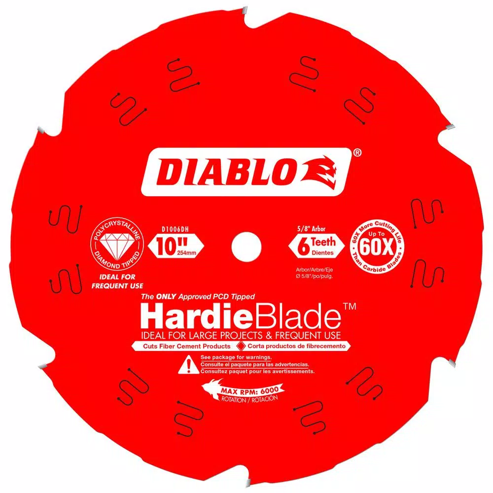 Diablo ‘s premium HardieBlade 10 in. x 6-Tooth PCD Fiber Cement Saw Blade is the only saw blade recommended by James Hardie. The newly enhanced JamesHardie blade features new laser-cut stabilizer vents for cleaner cuts. The advanced stabilizer vents feature a permanent filler baked in from top to bottom for absorbing noise and preventing sideways movement, allowing the blade to slice through your material cleanly, quickly and accurately. Designed with Polycrystalline Diamond (PCD) tipped teeth, the blade is specially formulated to combat the abrasive properties of fiber cement for exceptionally long cutting life, lasting up to 60 times longer than regular carbide. Super-thin kerf laser-cut blade allows for fast, clean, super thin cuts that reduce reparable dust generation by up to 50% for a cleaner, safer work place. Spark eroded Triple Chip Grid (TCG)-Tooth geometry is specially designed and created using spark erosion dramatically increases the cutting life of the blade in all fiber cement products. Laser-cut stabilizer vents absorb noise and reduce vibration for a cleaner cut and longer life.