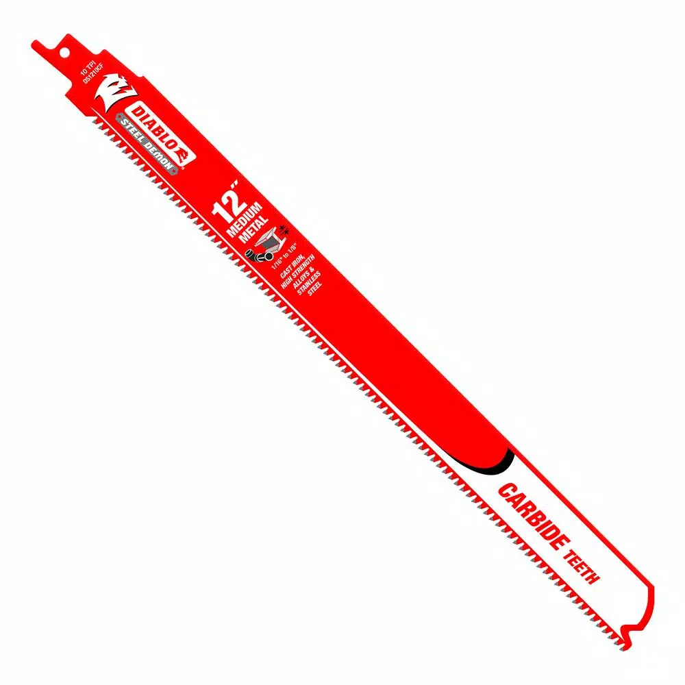 Diabloβs new Steel Demon Carbide reciprocating blades featuring 10 TPI are the first carbide teeth blades designed specifically for cutting medium metals and high strength alloys. This high performance carbide blade delivers an unmatched 50 times longer cutting life than standard bi-metal blades in medium metal cutting applications between 3/32 in. to 1/4 in. The blades 10 TPI provides cleaner/smoother cuts in metal, while the increased blade body height produces straighter cuts with less vibration.