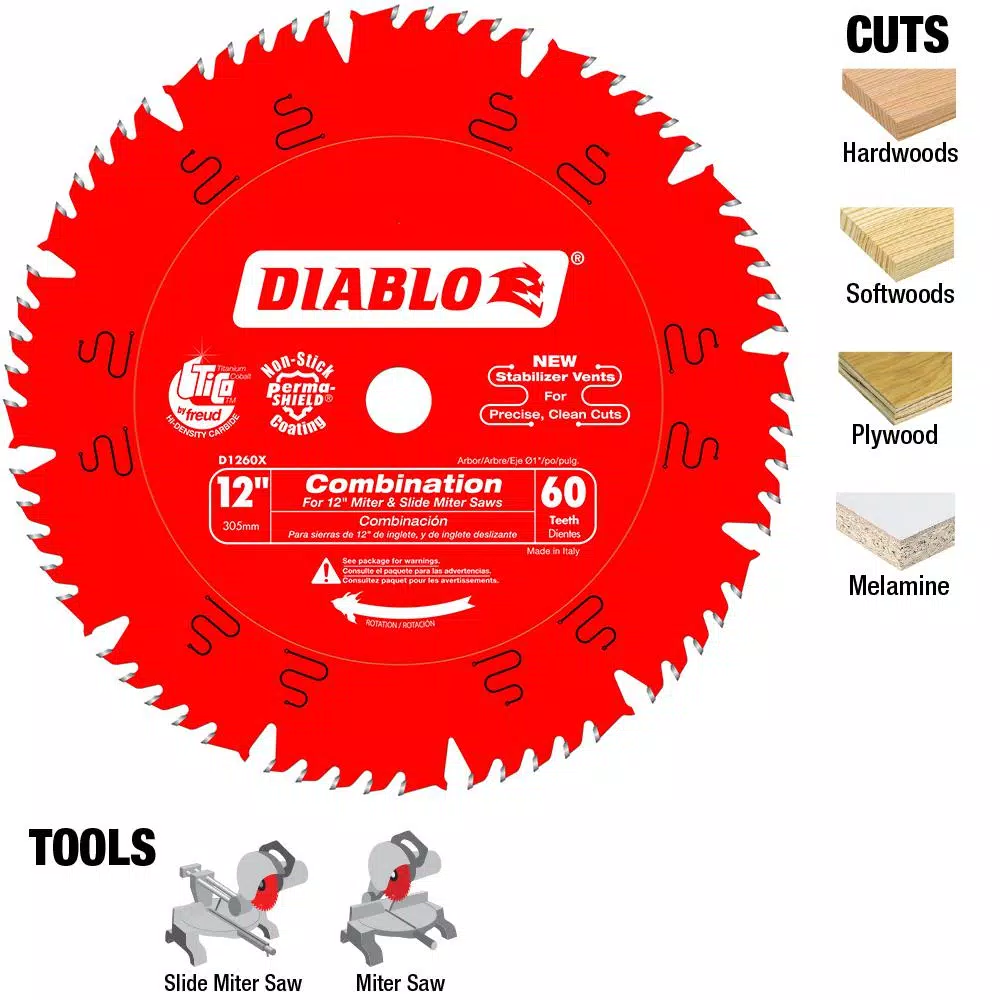 Diabloβs next generation 12 in. x 60 Tooth Combination Carbide Circular Saw Blade features new laser-cut stabilizer vents for precise and clean cuts in a variety of wood materials. The advanced stabilizer vents feature a permanent filler baked in from top to bottom for absorbing noise and preventing sideways movement, allowing the blade to slice through wood cleanly, quickly and accurately. Constructed with TiCo Hi-Density special-blend carbide, Diabloβs 12 in. combination blade produces razor sharp cuts and provides 5X longer cutting life. The laser cut heat expansion slots allow the blade to expand and contract during use, keeping the cut true and straight. This blade is excellent when working on multi-purpose projects such as cabinet work, millwork and furniture construction.