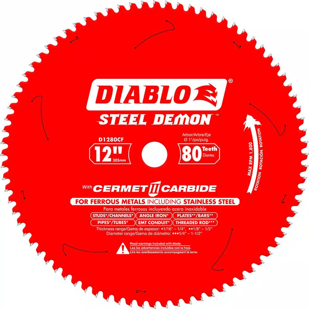 Diabloβs new Steel Demon Cermet blades cut both metal and stainless steel while providing 5x the cutting performance than standard metal cutting blades. By delivering the ultimate metal cutting performance and unmatched value story, this blade is a game changer for metal cutting. This blade features new, exclusive innovation with specially formulated Cermet teeth with a Triple Chip Grind Tooth Design, laser cut blade bodies, anti-vibration technology, and PERMA-SHIELD non-stick coating to deliver precise cuts with no sparks and cool, burr-free edges.