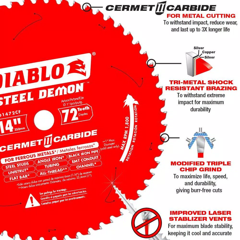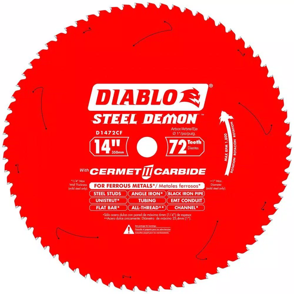 Diabloβs new Steel Demon 14 in. 72-Teeth per in. Cermet circular saw blades deliver 3X the life of a standard carbide-tipped blade in metal cutting applications. This blade features new, exclusive innovation with a special Triple Chip grind and Perma-SHIELD coating to provide maximum cutting life in a wide variety of ferrous metals.
