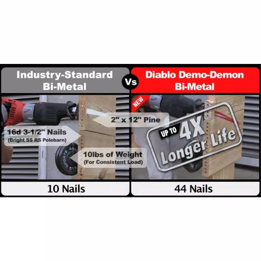 Tackle an assortment of demolition and remodeling tasks with this dependable 14-Piece Reciprocating Saw Blade Set + 2 Free Carbide Recip blades from Diablo. Demo Demon blades blaze through nail-embedded wood with amazing ease to facilitate fast teardowns of walls and framing materials; Steel Demon blades are designed to slice through metal so you can quickly dismantle a variety of pipes, bars and beams up to 1/2 in. thick. General-purpose blades are also included with this comprehensive set, as is a handy carrying case to keep all components organized and protected from job site or workshop perils.