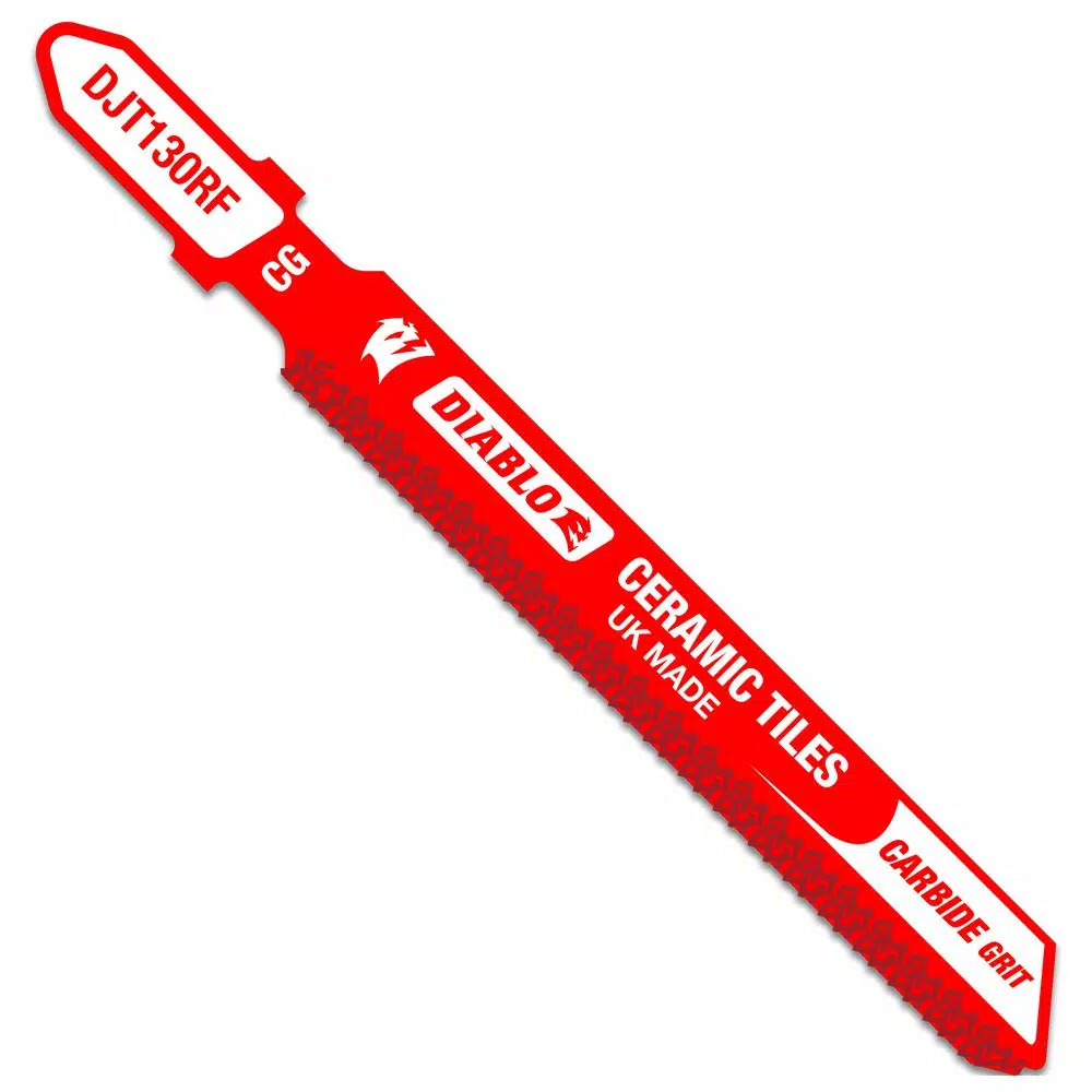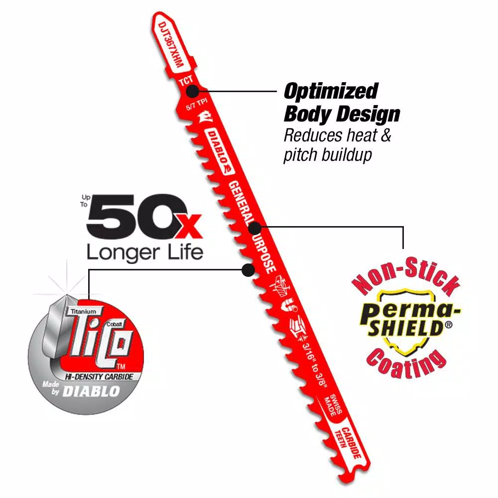 DIABLOβs carbide grit jig saw blades deliver extreme durability and superior cutting life in abrasive materials such as soft and ceramic tile and glass. High-performance carbide grit for longer cutting life versus standard jig saw blades. The optimized blade design and Perma-SHIELD non-stick coating reduces heat and pitch build up for fast and clean cuts. T-shank design fits all combo and most U-shank cordless and corded jig saws.