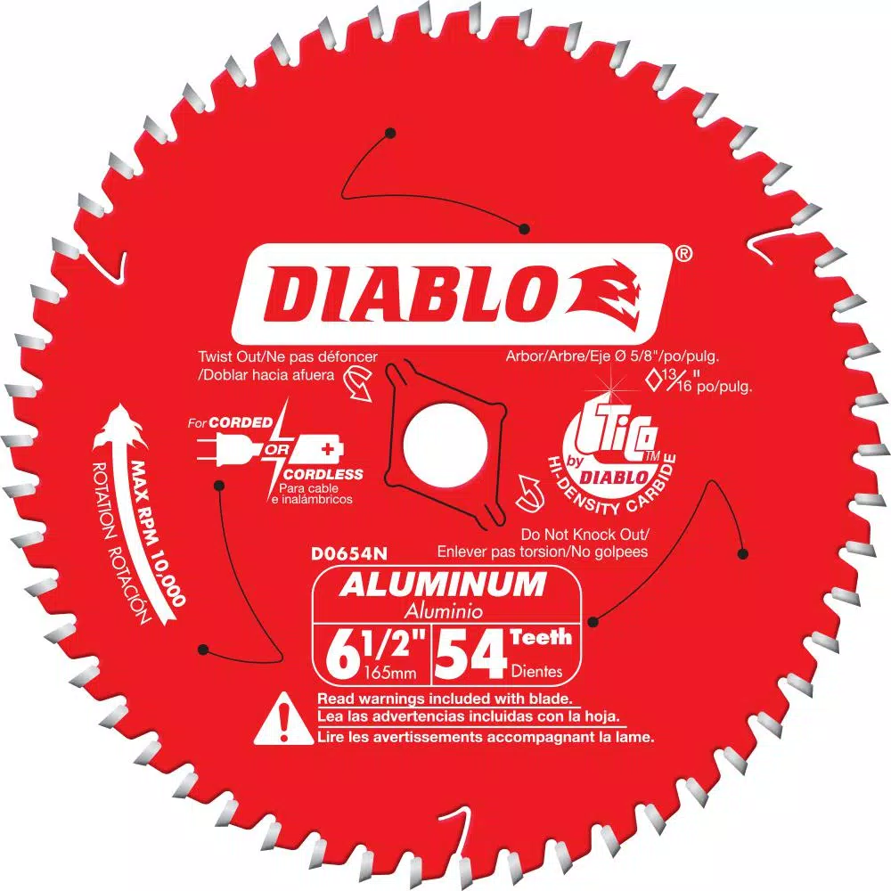 DIABLOβs next generation Aluminum saw blades are optimized for cutting thin (up to 1/8 in.), medium (3/32 in. to 1/4 in.) and thick (3/16 in. to 7/16 in.) aluminum metals. Featuring the new, specially formulated DIABLO TiCo Super-Density Micro-Grain Carbide, these radical blades withstand impact, reduce wear, provide clog free cuts and last longer than standard carbide in metal cutting applications. The specially formulated metal cutting carbide teeth feature a Triple Chip Grind (TCG) Tooth Design for clean, burr-free finishes, virtually eliminating any type of rework. Tri-Metal Shock Resistant Brazing allows these Aluminum blades to slice through metal materials while withstanding extreme impact for maximum durability. DIABLOβs Aluminum saw blade series is ideal for corded and cordless saws when on-the-job cutting non-ferrous metals such as aluminum extrusions, copper pipe, brass plate, etc.