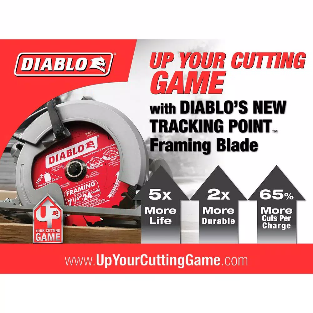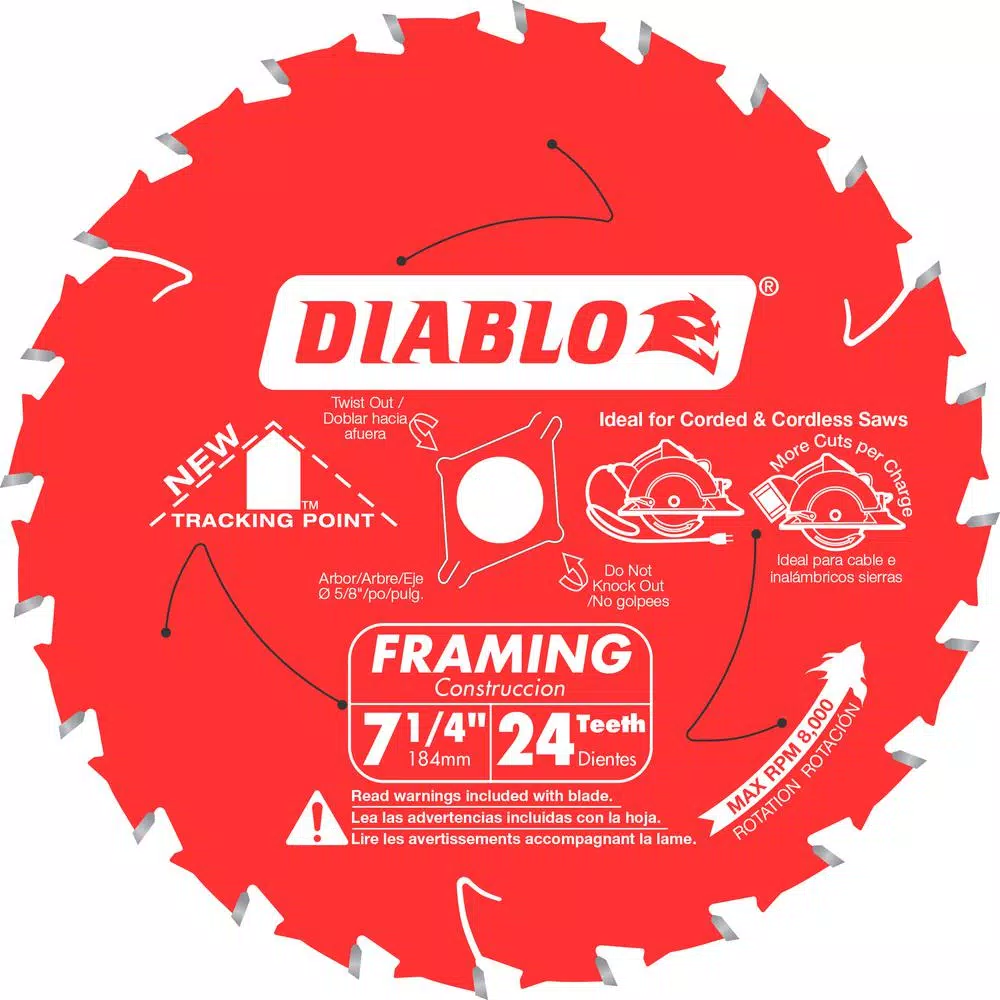 Diablos next generation 7-1/4 in. 24-teeth tracking point saw blades feature the first ever, tracking point tooth design and the newly enhanced anti-vibration design. Diablos 7-1/4 in. 24-teeth framing blade with new tracking point tooth design delivers maximum life and durability with effortless cutting performance for five times longer life, two times more durability and increased stability. Up your cutting game with this one-of-a-kind tracking point tooth grind for unmatched cutting performance and efficiency. This is the only 7-1/4 in. Blade on the market to include tracking point tooth design; making it ideal for framers, roofers, remodelers, concrete formers or anyone wanting ultimate cutting performance in pressure treated wood, 2x lumber, plywood, hardwoods and softwoods.