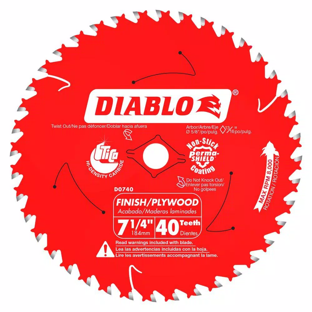 The advanced laser-cut slim kerf on the Diablo 7-1/4 in. x 40-Tooth Finishing Saw Blade creates a thin swath for less material removal and fast, effortless operation. Constructed with TiCo Hi-Density special-blend carbide, this durable circular saw blade is outfitted with 40 teeth to make smooth, finely finished cuts in wood and plywood. The Perma-SHIELD nonstick coating reduces drag while stabilizer vents absorb noise and vibration to keep the blade straight.