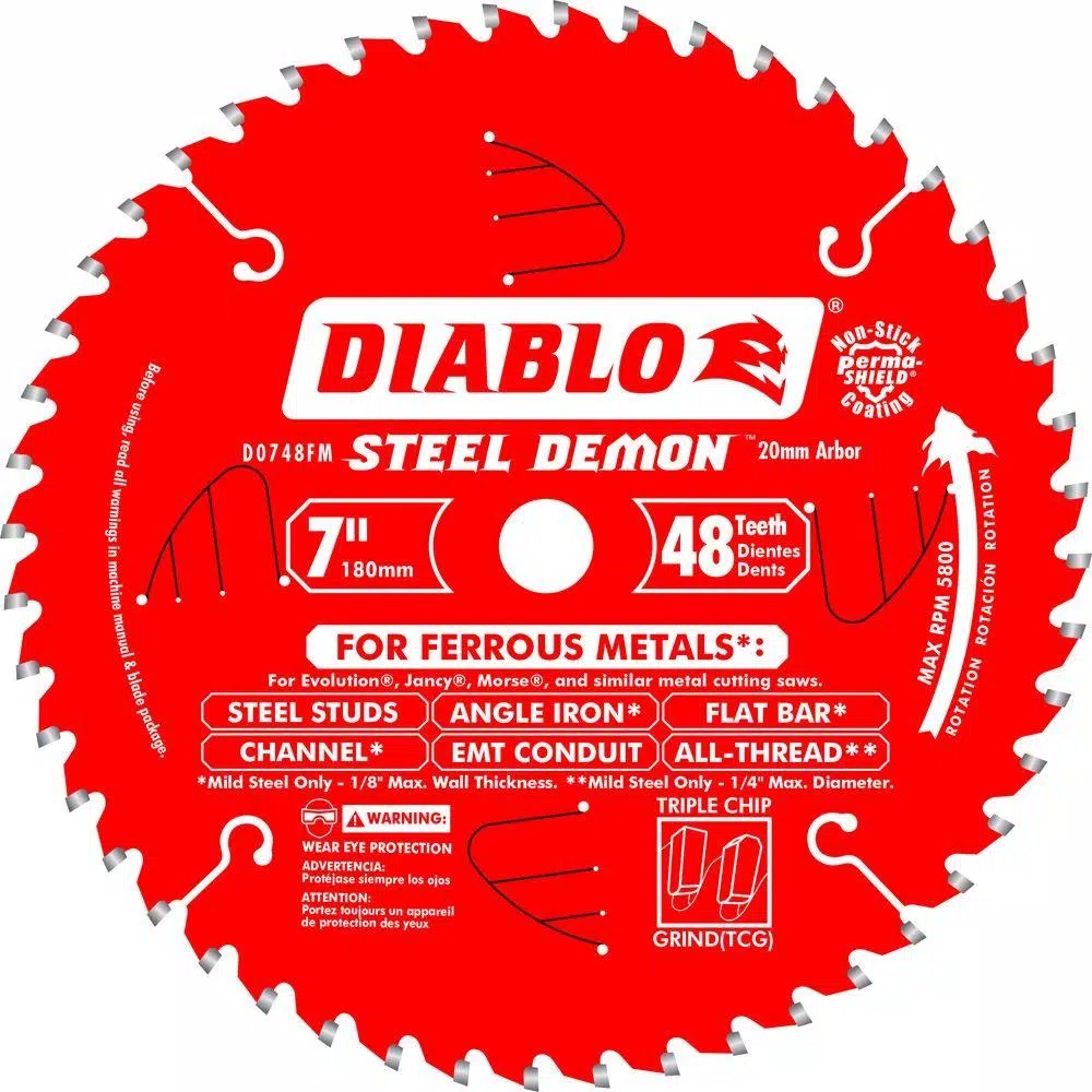 Diabloβs premium Steel Demon 7 in. x 48 Tooth 20mm Arbor Carbide Ferrous Metal Saw Blade has teeth made of Ti-Co high density carbide with titanium for a design that withstands impact, reduces wear, and lasts longer that standard carbide in metal cutting applications. Tri-metal shock resistant brazing allows metal cutting carbide tips to withstand extreme impact for maximum durability. Non-stick Perma-Shield coating protects the blade from heat and corrosion, reduces friction and pitch buildup. Laser-cut stabilizer vents absorb noise and reduce vibration for a cleaner cut and longer life.