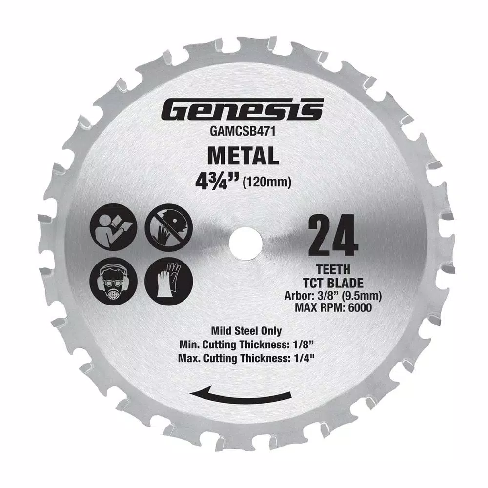 The GAMCSB471 dry-cut metal cutting saw blade is a metal cutting replacement blade for the Genesis GMCS547C 4-3/4 in. Control Grip Metal cutting saw. The blade is made from steel and comes with 1 blade per package. This blade produces burr free cuts with 24 teeth that are carbide tipped without the need for oils or coolants.