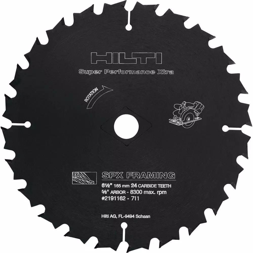The Hilti 6-1/2 in. 24 Teeth SPX Framing Blade (5-piece) is a high performing circular saw blade. These blades are designed to rip through wood to help you complete your woodworking projects. This premium circular saw blade is ideal for wood framing, offering more cuts per battery charge in cordless cutting. Outperform the competition when you buy your 5-pack of Hilti wood framing blades.