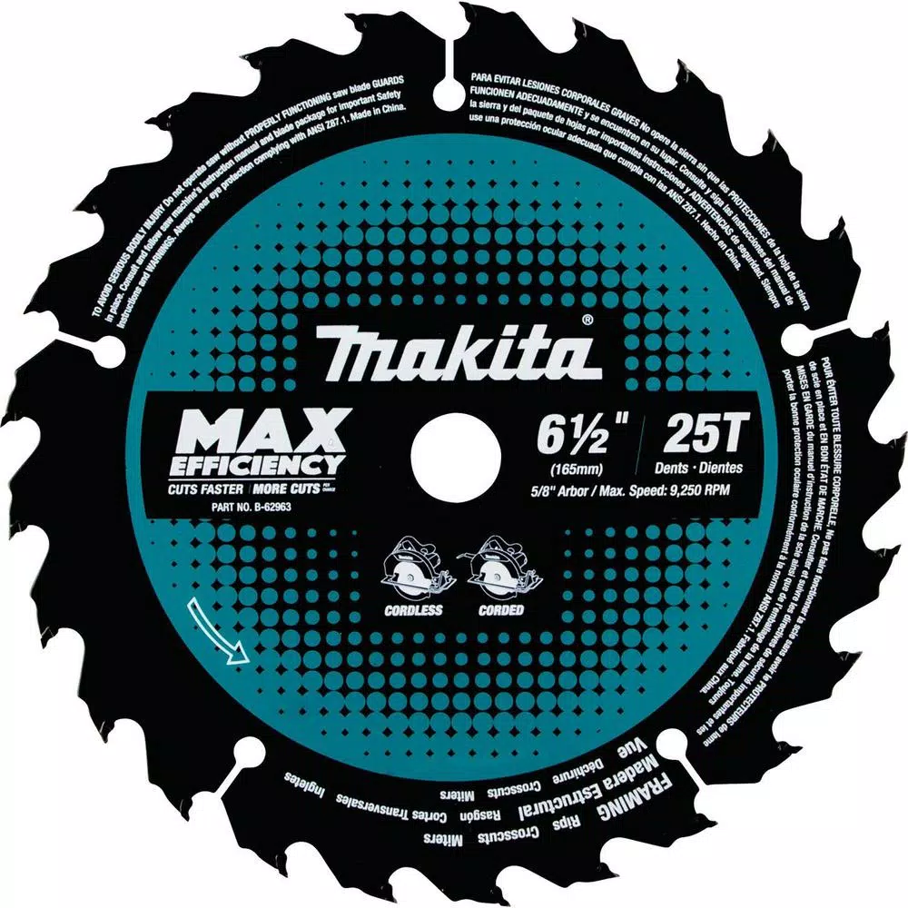 The Makita 6-1/2 in. 25T Carbide-Tipped Max Efficiency Ultra-Thin Kerf Circular Saw Blade is engineered for use with cordless circular saws, and is ideal for a full range of wood cutting applications. The ultra-thin kerf design (only 0.055 in.) and specially engineered blade teeth assist in reducing the load put on the tool while cutting. In addition, the reduced swing width allows for smoother material removal with less cutting resistance. The result is increased cutting efficiency and up to 25% more cuts per charge compared to standard blades. The high grade Tungsten Carbide tips are engineered for improved durability and longer blade life, and the special ATAFR (Alternate Top Alternate Face with Raker) carbide tips provide smoother and faster cuts. This saw blade is for use with 6-1/2 Cordless Circular Saws with 5/8 arbor (models XSS01Z and XSH03M, sold separately).