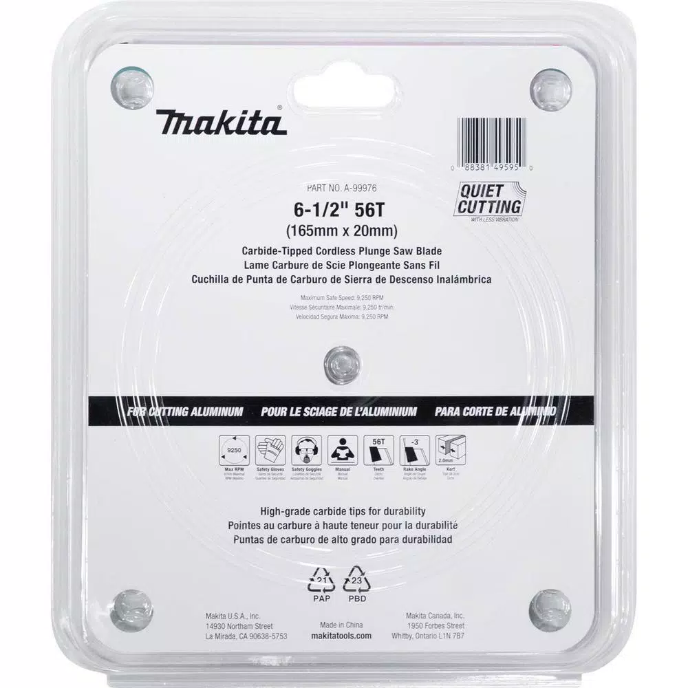 The Makita 56T Carbide-Tipped Saw Blade is the ideal accessory for the Makita 6-1/2 in. Plunge Circular Saw (model XPS01, sold separately). With the XPS01, the A-99976 is an ideal blade for cutting aluminum applications. The Blade features high-grade carbide tips for improved durability, and is engineered for smoother cutting.