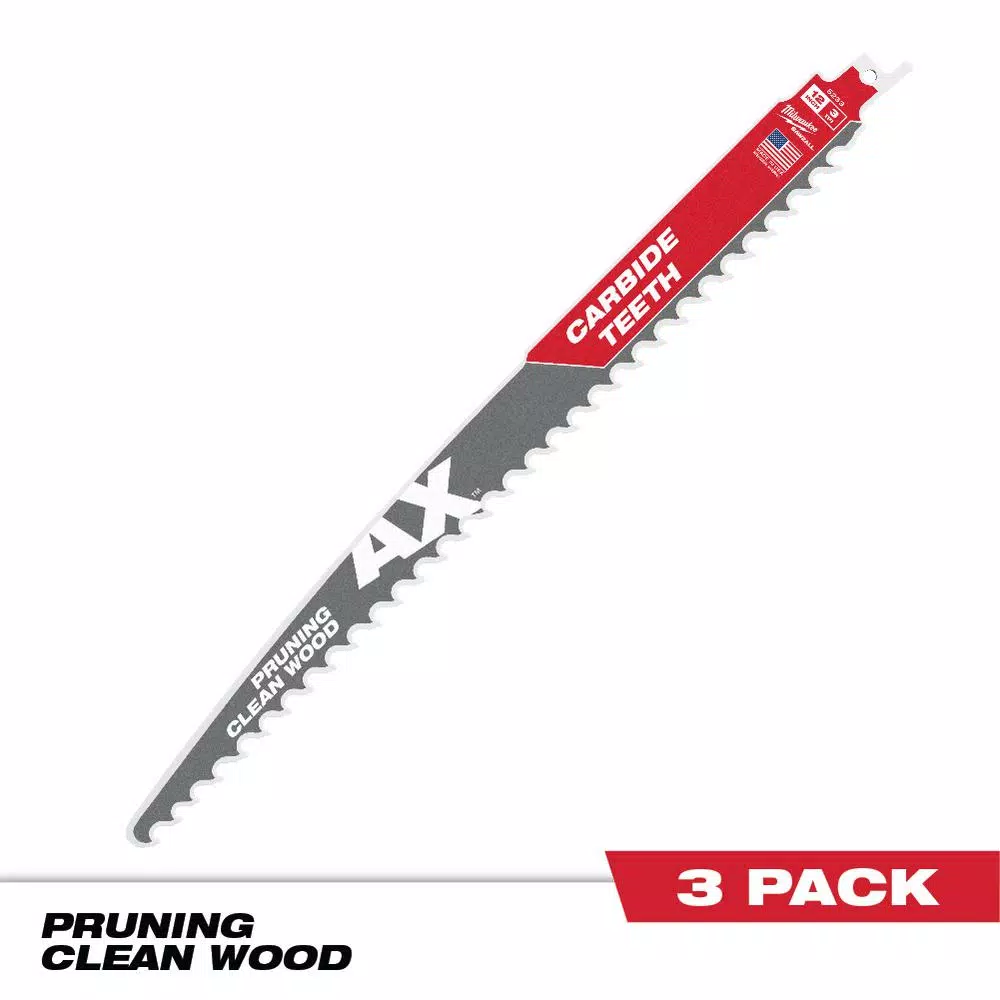 The Milwaukee 12 in. 3 TPI The AX with Carbide Teeth for Pruning & Clean Wood SAWZALL Blade 3-Pack is designed for the fastest above and below ground pruning and clean wood cutting applications. This SAWZALL pruning blade offers up to 50X more life verses carbon steel reciprocating saw blades available today. The Milwaukee AX blade for pruning and clean wood cutting offers 3 TPI design, which allows for the fastest cutting in clean wood and a low profile blade geometry for root removals. The optimized carbide teeth withstand abrasives like rock, sand and dirt as users remove roots for trenches or stumps for tree removals. Milwaukee carbide teeth products allow users to cut longer, cut more and cut faster than other carbide-teeth blades on the market.