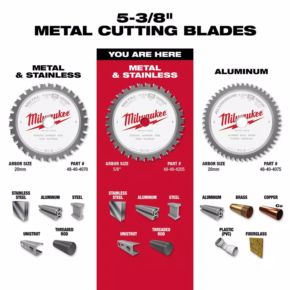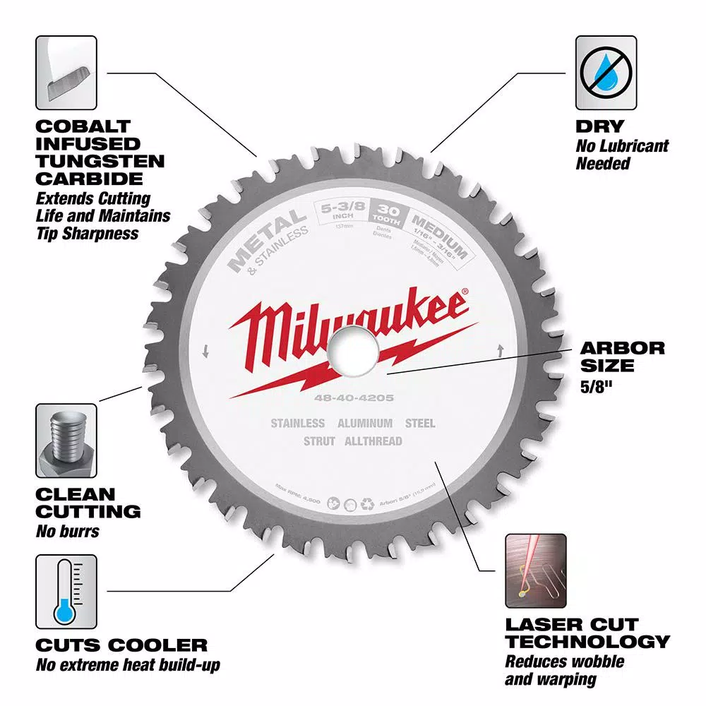 The Milwaukee 5-3/8 in. 30T Metal and Stainless Cutting Circular Saw Blades are specifically designed to exceed contractorβs expectations for blade life, cut quality and speed in the most demanding metal cutting applications β without a lubricant. The metal cutting circular saw blades feature hand-tensioned hardened alloy steel bodies. This extends the userβs blade life and delivers them the highest quality cuts available. The blades feature Carbide-Tipped Teeth with Alternate Top Bevel grind enabling users to shear through metal delivering you burr-free, cool-to-touch cuts.