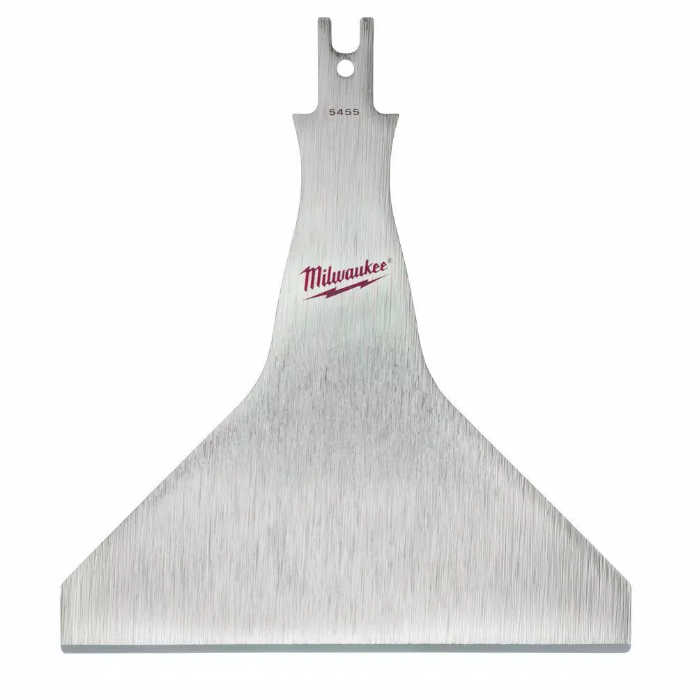 Compatible with all Milwaukee Sawzall, Hackzall and all other reciprocal saws, the new 5 in. Scraper Blade converts several slow and strenuous hand tool applications into fast and effortless tasks. The 5 in. Scraper Blade compliments both the 1-1/2 in. and 3 in. Scraper Blades currently available. Together, these offerings provide comprehensive solutions across the spectrum of soft and hard materials. Features of the scraper blades include induction hardened edges for maximum durability, a corrosion resistant coating for longer life and chamfered corners for greater control. In addition to these key features, the 5 in. Scraper Blade has an innovative Winged Tang design for increased blade support. The scraper blades offer a great solution for removing materials such as linoleum flooring, strong adhesives, paint, glue, thin-set, drywall mud, rust, etc.