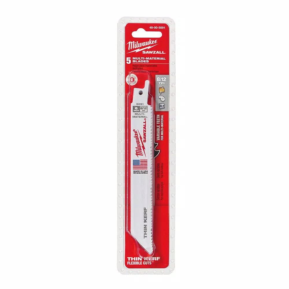 The Milwaukee Sawzall 6 in. 8/12 TPI Reciprocating Saw Blades (5-Pack) can be used to cut through wood, nail-embedded wood, composition material, plastic, ferrous and non-ferrous metals and cast iron. Double relief angle reduces tooth stress for long life. Precision forming process creates sharper teeth for fast cutting. Matrix II bi-metal teeth for greater durability.