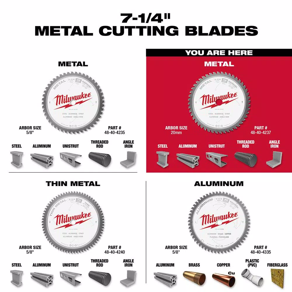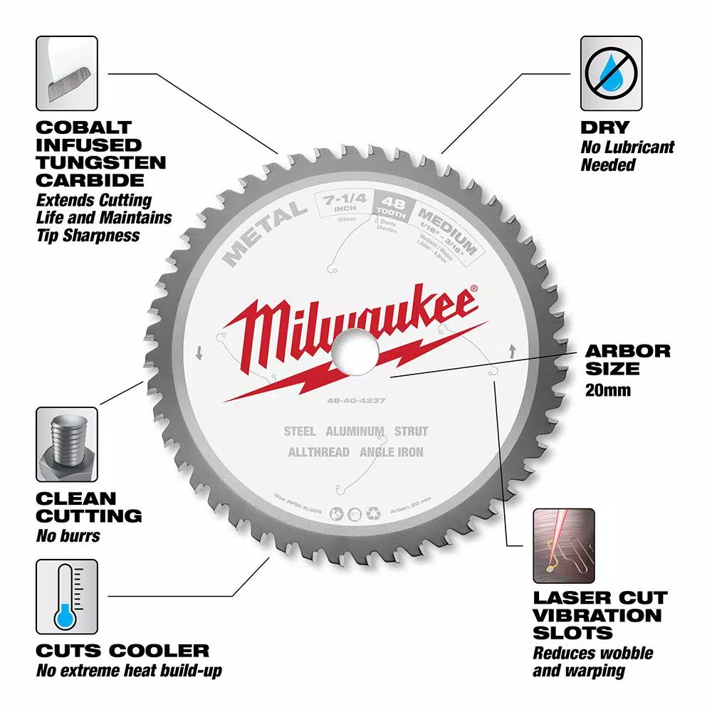 The Milwaukee 7-1/4 in. 48T Metal Cutting Circular Saw Blades are specifically designed to exceed contractorβs expectations for blade life, cut quality and speed in the most demanding metal cutting applications β without a lubricant. The metal cutting circular saw blades feature hand-tensioned hardened alloy steel bodies. This extends the userβs blade life and delivers them the highest quality cuts available. The blades feature Carbide-Tipped Teeth with Alternate Top Bevel grind enabling users to shear through metal delivering you burr-free, cool-to-touch cuts.