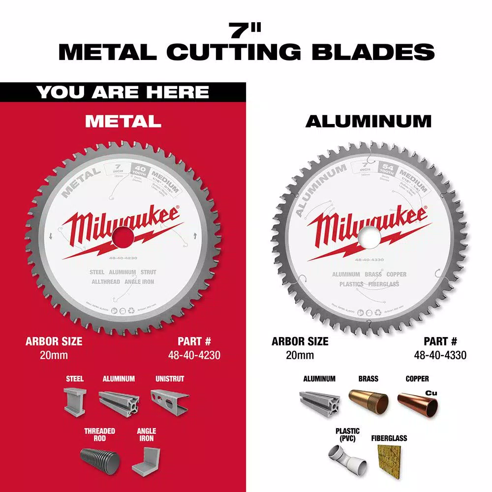 The Milwaukee 7 in. 48T Metal Cutting Circular Saw Blades are specifically designed to exceed contractorβs expectations for blade life, cut quality and speed in the most demanding metal cutting applications β without a lubricant. The metal cutting circular saw blades feature hand-tensioned hardened alloy steel bodies. This extends the userβs blade life and delivers them the highest quality cuts available. The blades feature Carbide-Tipped Teeth with Alternate Top Bevel grind enabling users to shear through metal delivering you burr-free, cool-to-touch cuts.