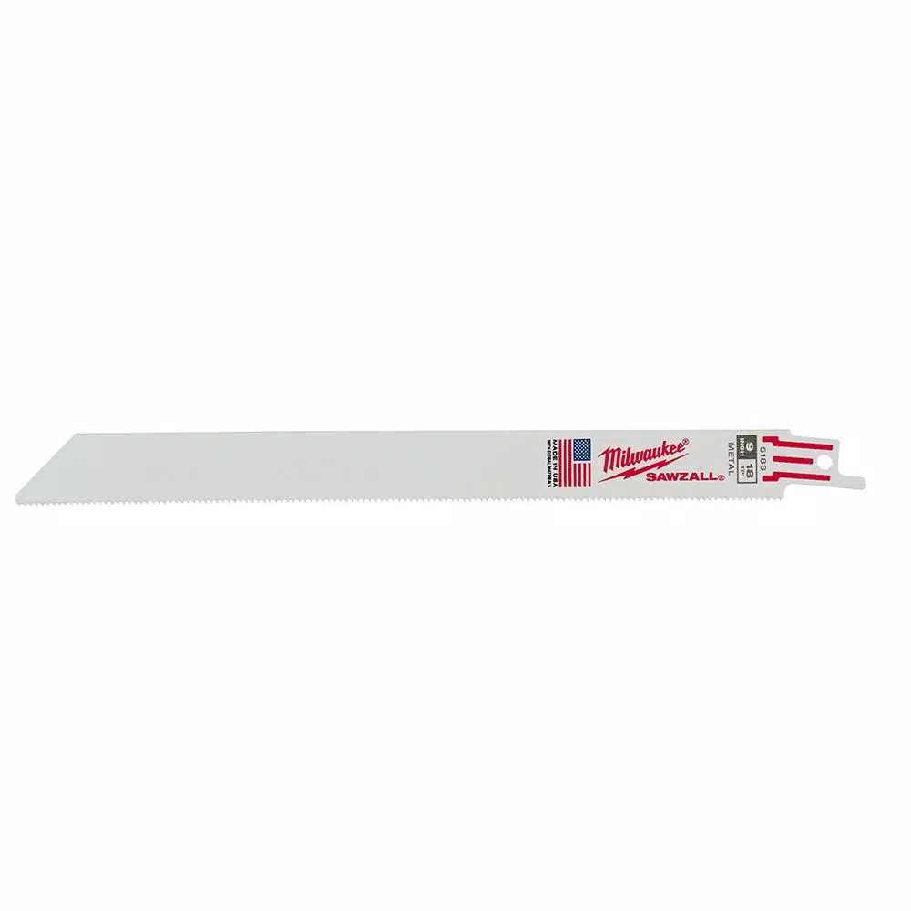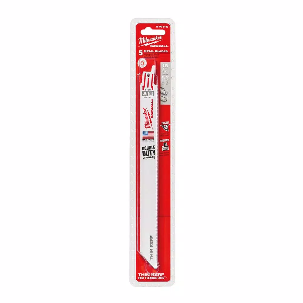 The Milwaukee 48-00-5188 9 in. x 18 Teeth per in. Thin Kerf metal-cutting Blade with the Double Duty Upgrade feature a tooth form that is optimized for the longest life and increased speed. Tough Neck is engineered to protect against tang breakage and delivers the strongest SAWZALL blade tang on the market. Maintaining a short profile and thin body, these Blades are ideal for making fast, flexible cuts. The Milwaukee 48-00-5188 contains 5 Blade.