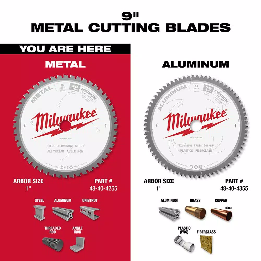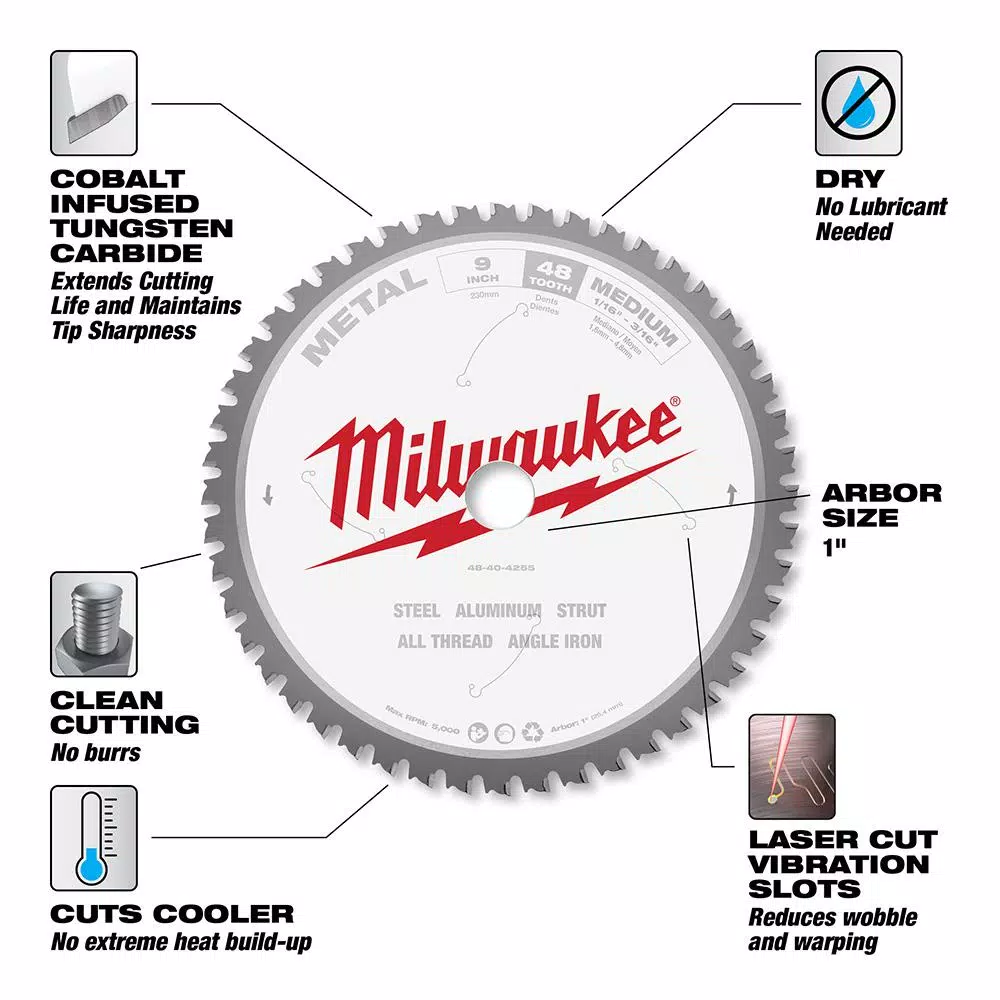 The Milwaukee 9 in. 48T Metal Cutting Circular Saw Blades are specifically designed to exceed contractorβs expectations for blade life, cut quality and speed in the most demanding metal cutting applications β without a lubricant. The metal cutting circular saw blades feature hand-tensioned hardened alloy steel bodies. This extends the userβs blade life and delivers them the highest quality cuts available. The blades feature Carbide-Tipped Teeth with Alternate Top Bevel grind enabling users to shear through metal delivering you burr-free, cool-to-touch cuts.