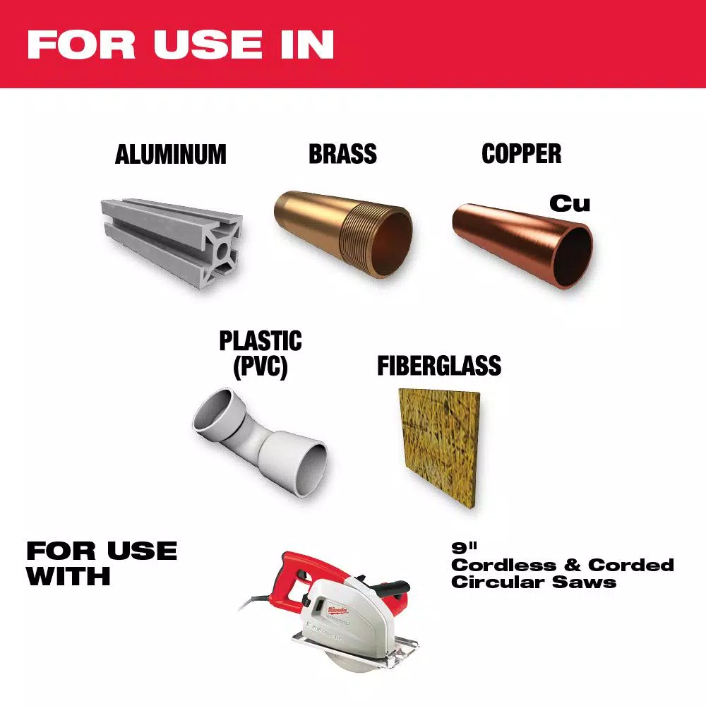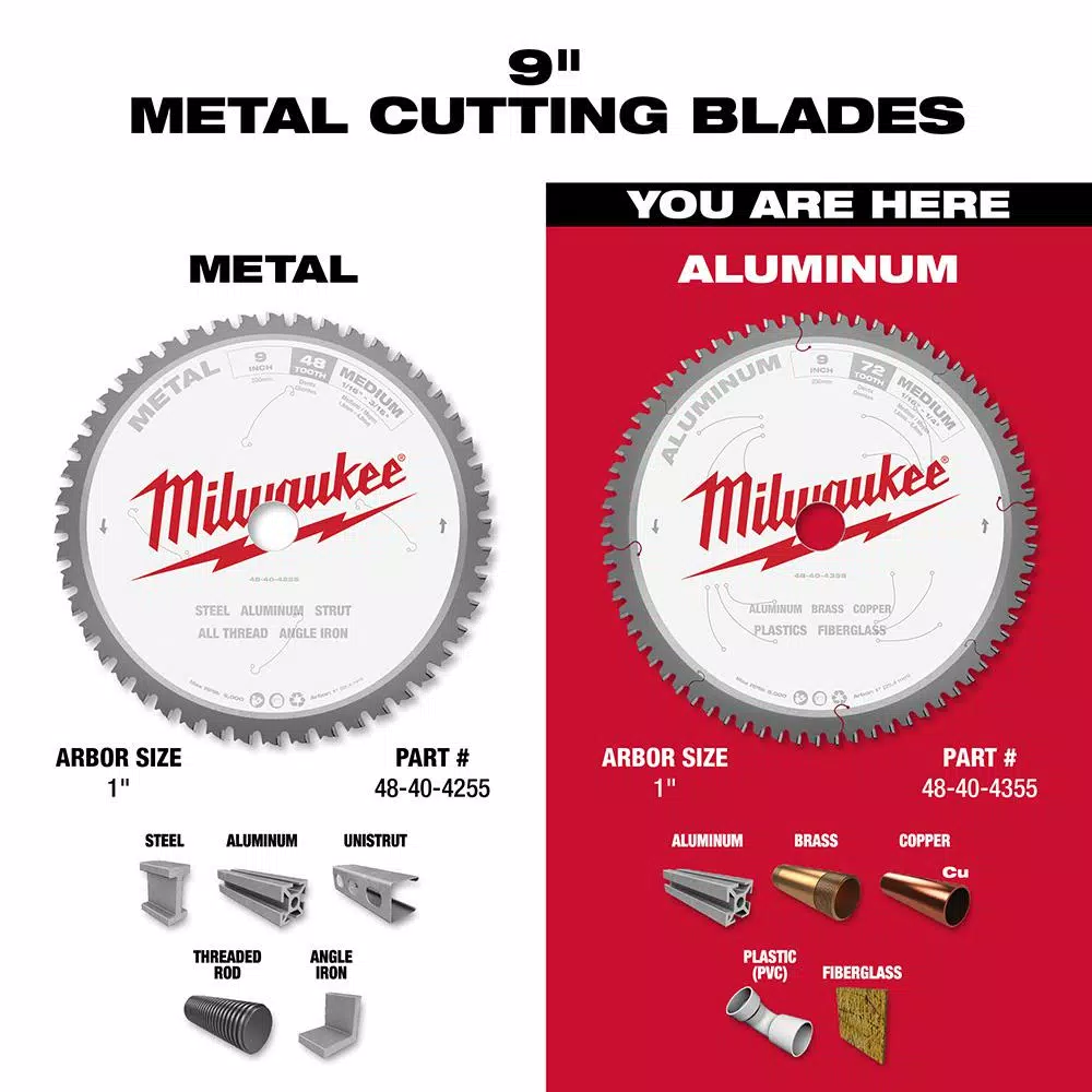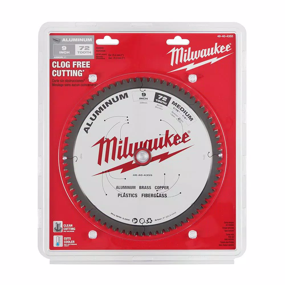 The Milwaukee 9 in. 72T Aluminum Cutting Metal Circular Saw Blades are specifically designed to exceed contractorβs expectations for blade life, cut quality and speed in the most demanding metal cutting applications β without a lubricant. The metal cutting circular saw blades have hand-tensioned hardened alloy steel bodies. This extends blade life and delivers the highest quality cuts available. The blades have Carbide-Tipped Teeth with Alternate Top Bevel grind to shear through metal delivering burr-free, cool-to-touch cuts.