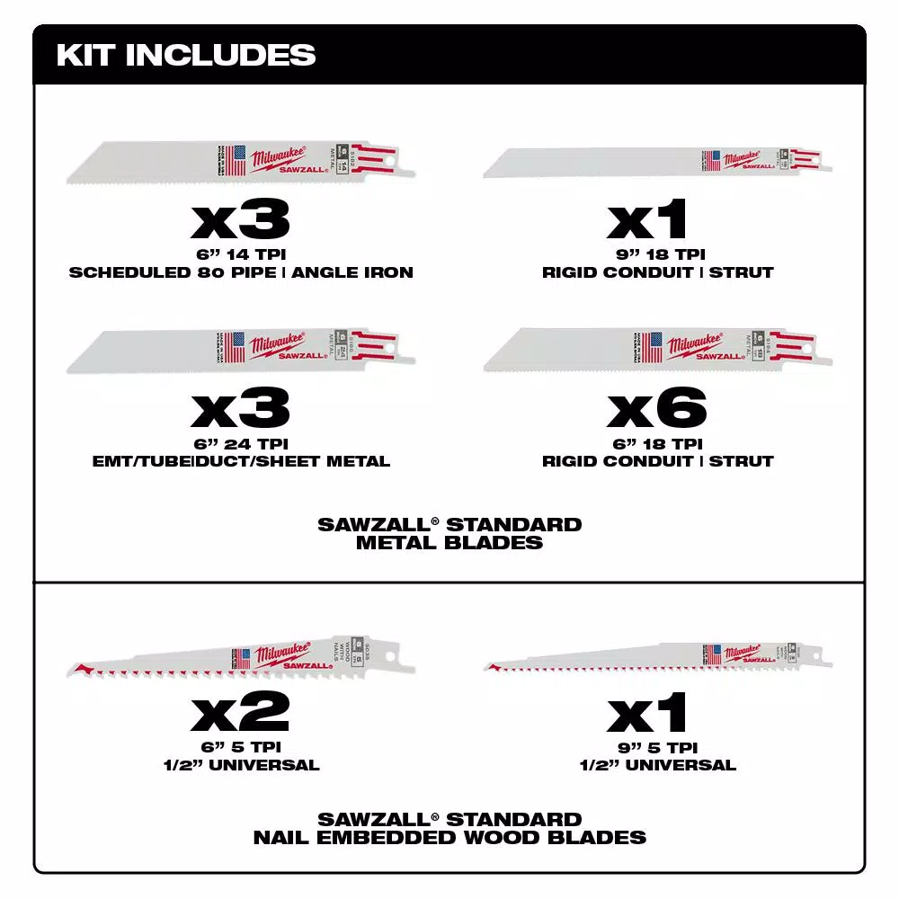 - Includes: (3) 6 in. 14 TPI Metal THE TORCH™ SAWZALL® Blades, (3) 6 in. 24 TPI Metal SAWZALL® Blades, (2) 6 in. 5 TPI SAWZALL® Blades, (1) 9 in. 18 TPI Metal THE TORCH™ SAWZALL® Blade, (1) 9 in. 5 TPI Wood THE AX™ SAWZALL® Blade, (6) 6 in. 18 TPI Metal SAWZALL® Blades