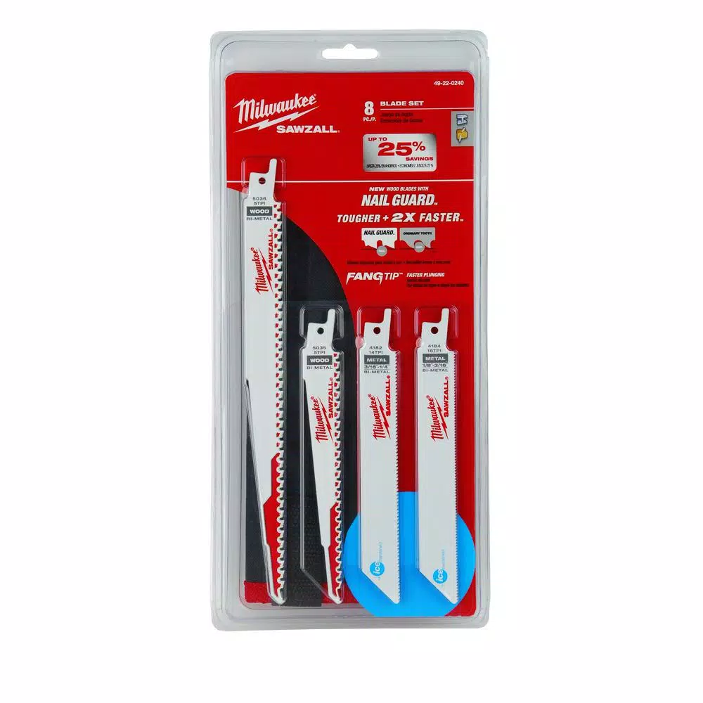 The MILWAUKEE 8-piece SAWZALL blade set features an assortment of standard SAWZALL blades for wood and Ice Hardened metal cutting SAWZALL blades for a broad range of professional applications. Milwaukee Ice Hardened metal is cryogenically treated to minimize soft metal (austenite) to create a harder, more durable metal (martensite). The 8-Piece SAWZALL blade set includes two 6 in. wood cutting blades for increased control, two 9 in. wood cutting blades for greater cutting capacity, two 6 in. 14 TPI blades for medium to thick metal cutting and two 6 in. 18 TPI blades for thin metal cutting. This set includes a roll-up pouch for convenient blade storage.