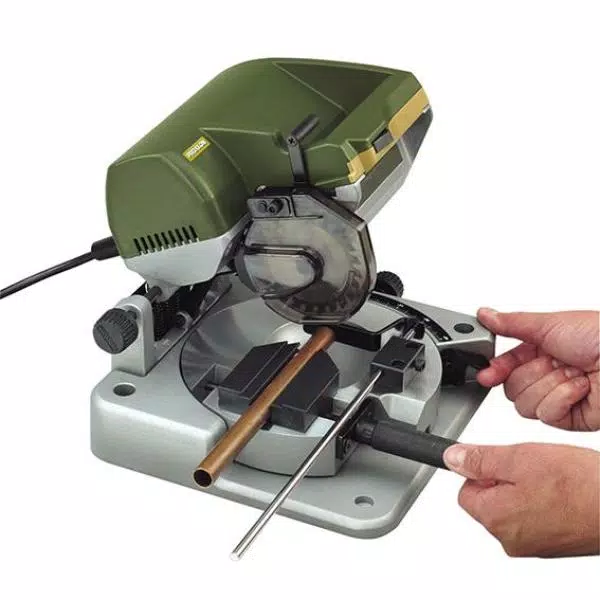 Proxxonβs Chop and Miter Saw is ideal for small precise mitered cuts. Instead of a swiveling saw head, the table rotates the work piece within a clamping jawed vise. Base includes a round table of pressure-cast aluminum and CNC-machined guides and fittings.